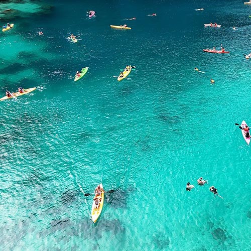 Twin Lagoon: This is the quintessential kayaking spot. The two lagoons are separated by a narrow limestone wall. At low tide, you can paddle through a small opening under the rock. At high tide, you’ll need to climb the wooden stairs, but having a kayak inside the second lagoon allows you to explore every turquoise corner far from the crowded boat docking area.